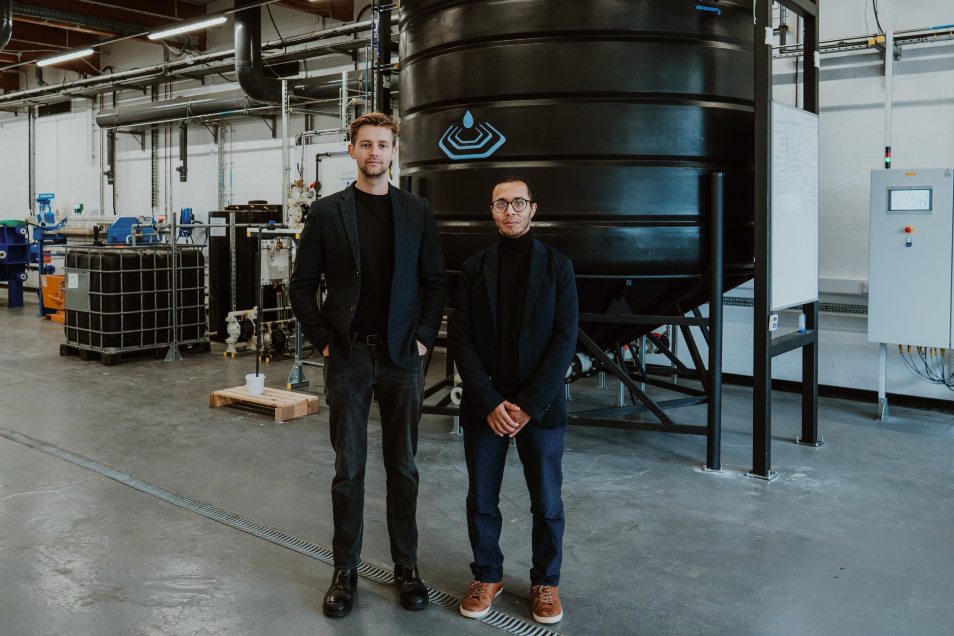 two men stand in front of large tank in a warehouse, looking at camera